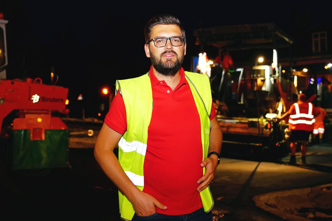 Romāns Kleins ir šajā objektā strādājošā ceļu būves uzņēmuma pārstāvis. Mēs pie viņa devāmies svarīga uzdevuma laikā – asfalta līmeņa regulēšanā, kas nepieciešama, lai nākotnē tam nodrošinātu pienācīgu ūdens novadīšanu.