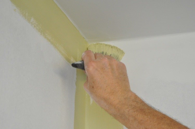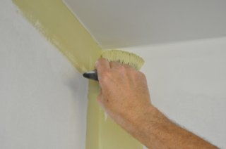 6. Krāsošanu sākam no stūriem un apmalēm. Tā kā šajā vietā nevar izmantot lielo krāsu rullīti, izmantojam plakano otu. Kad apmaļu un stūru zonas ir nokrāsotas, tad ņem talkā krāsu rullīti. Vispirms jākrāso slīpi, veidojot krusteniskas joslas, pēc tam izlīdzina krāsojumu, veicot horizontālas un vertikālas kustības. Šadā veidā var iegūt vienmērīgu krāsojumu.