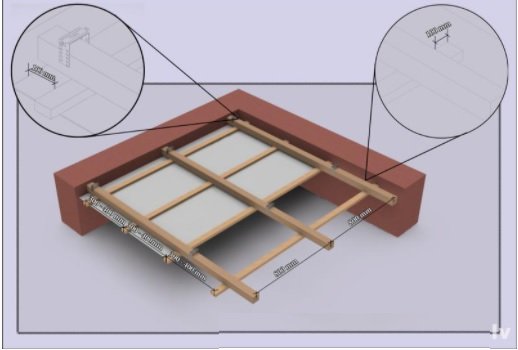 Karkasu veidojot no koka, izvēlētajiem kokmateriāliem jābūt sausiem un taisniem. Nesošās latas veidojam no 60mm x 50mm lielām latām, kuras montējam ar 800mm distanci vienam no otra. Latas pie griestu konstrukcijas ar stiprinājumiem, kuru distance nav lielāka par 1200mm. Kad nesošo latu montāža ir veikta, montējam apakšējās latas, (25mm x 50mm)kuras ar skrūvju palīdzību nostiprinām pie augšējām latām. Latas liekam ar 300-400mm distanci, montējot reģipsi gareniski, ar 500mm distanci montējot reģipsi šķērsām. Kad karkasa montāža ir paveikta, varam sākt skrūvēt reģipsi. Der zināt, ka reģipša skrūvju attālums montējot griestus jābūt ar 170mm distanci.Attēlos dotie izmēri ir maksimāli pieļaujamie.