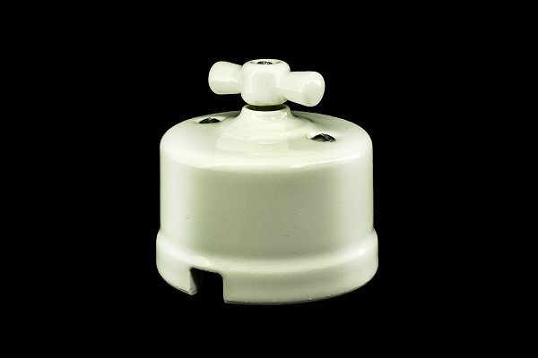 Balts retro stila slēdzis ar porcelāna apvalku un rototācijas slēdža mehānismu , piemērots, lai ieslēgtu un izslēgtu elektrības ķēdi no divām dažādām vietām.