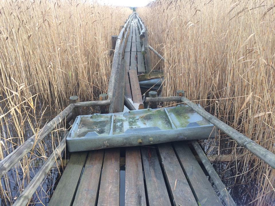 Izdemolēta populārā Kaņiera niedrāja laipa Ķemeru Nacionālajā parkā